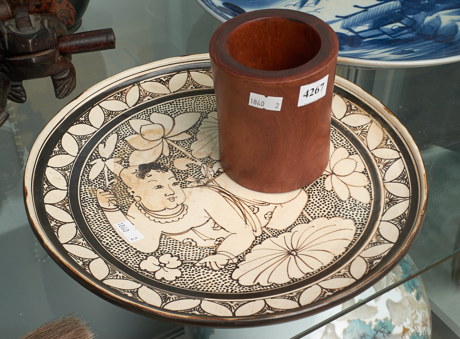 No noticeable losses to the dish, dirt residue to surface, the brush pot is in good condition.