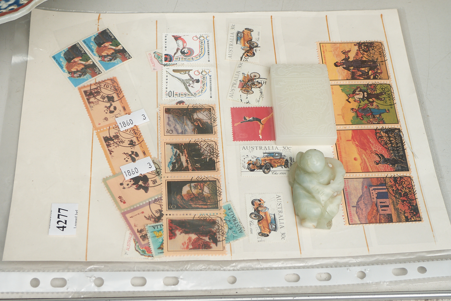 A SLEEVE CONTAINING CHINESE STAMPS TOGETHER WITH TWO STONE CARVINGS