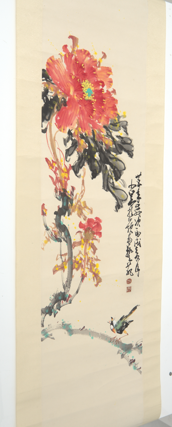 A TRADITIONAL CHINESE WATERCOLOUR SCROLL WITH BIRD AND FLOWER SCENE
