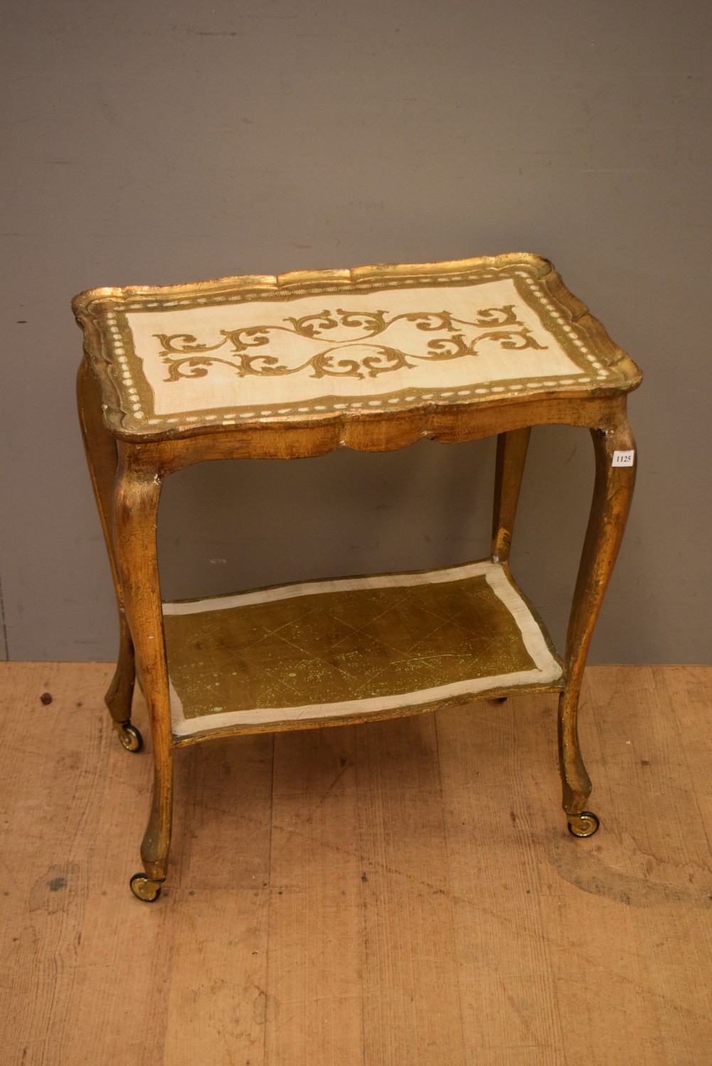 A SUPERB 1920S ITALIAN FLORENTINE GILTWOOD TWO TIER DRINKS/GIN TROLLEY (63H X 56W X 36D CM)