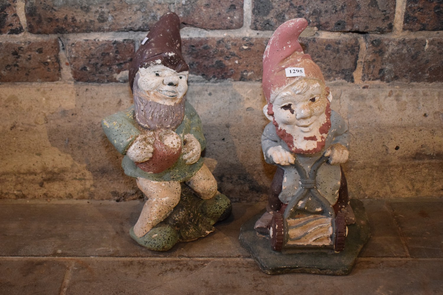 A PAIR OF 1940S ORIGINAL PAINTED CONCRETE GARDEN GNOMES (APPROX 37CM HIGH)