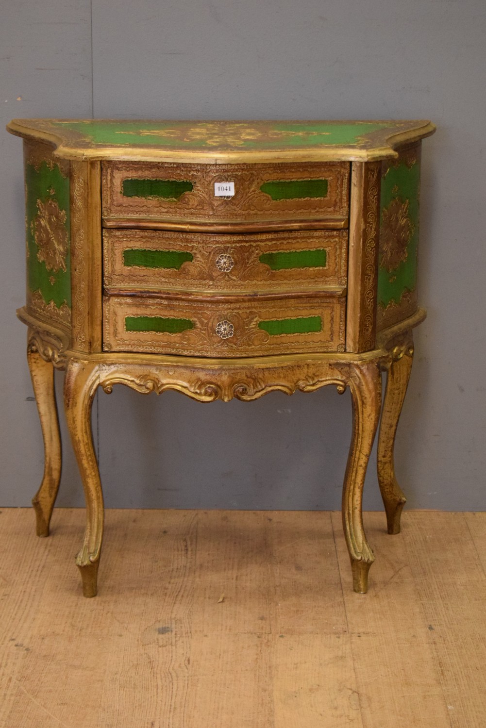 A SUPERB 1900S ITALIAN FLORENTINE GILTWOOD TWO DRAWER SIDE TABLE WITH GREEN ACCENTS (54H X 62W X 30D CM)