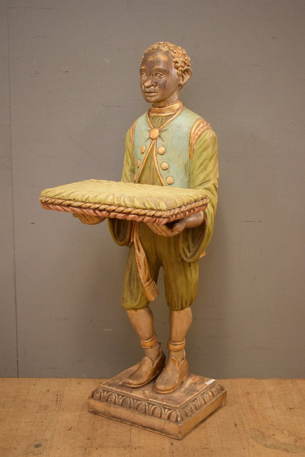 A RARE 1900S CARVED ITALIAN FLORENTINE GILTWOOD STANDING BLACKAMOOR FIGURAL TABLE (107H X 41W CM)