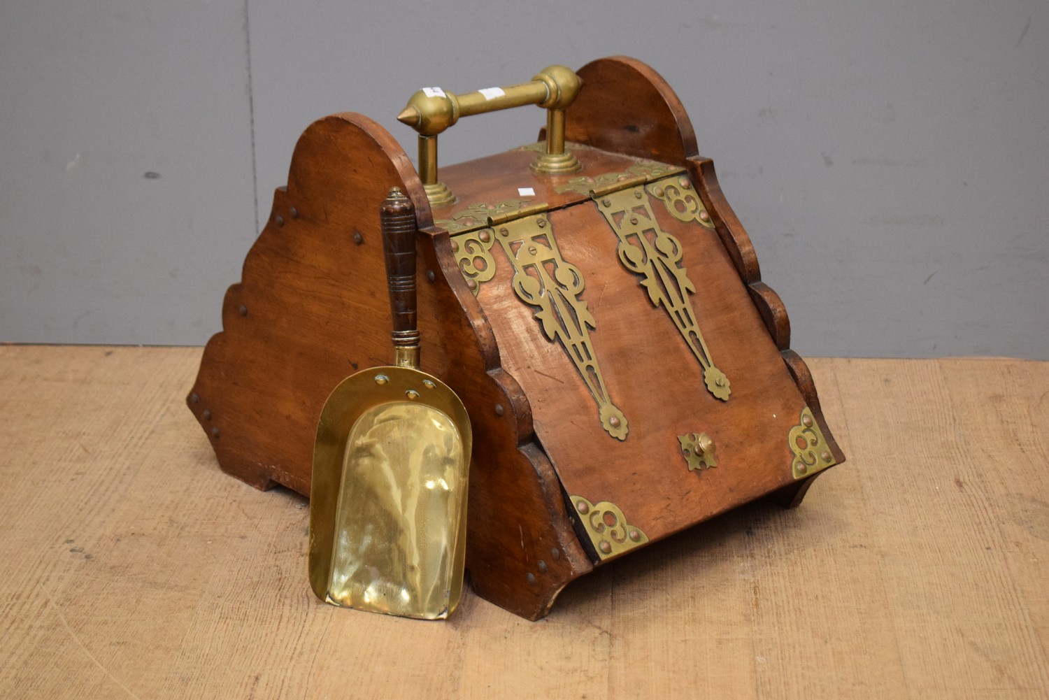 AN IMPRESSIVE 19TH CENTURY WOODEN AND BRASS BOUND COAL SCUTTLE WITH ORIGINAL SHOVEL AND INTERNAL LIFT OUT LINER (36H X 51W X 32D CM)