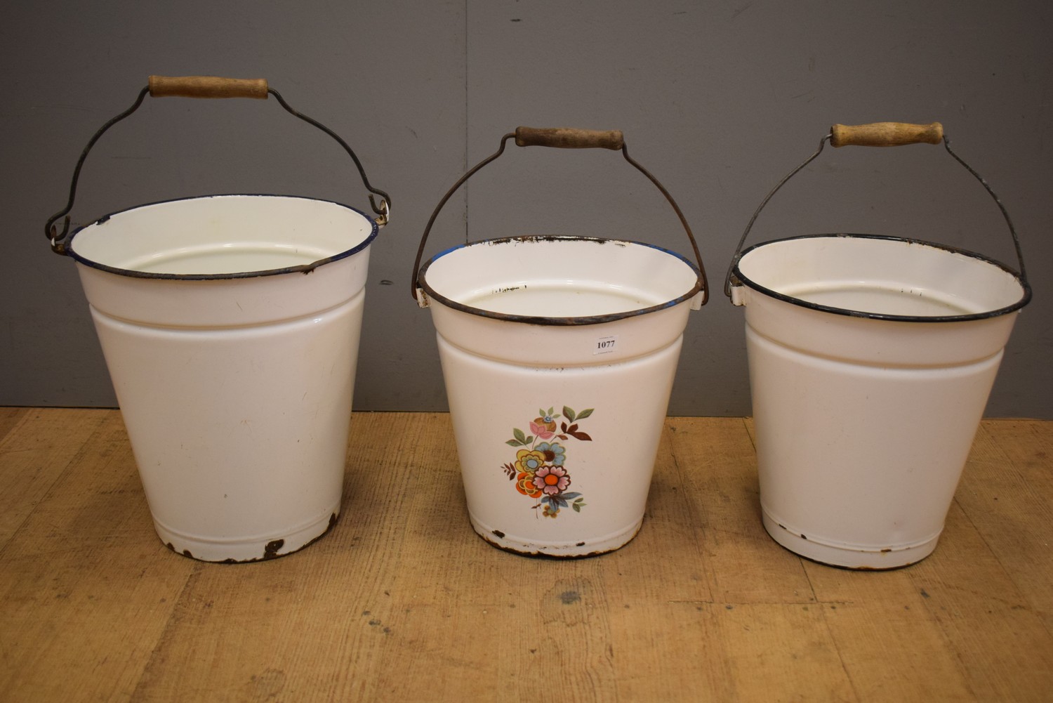 THREE 1900S FRENCH ENAMEL BUCKETS WITH WOODEN HANDLES (LARGEST 34H X 34 DIA CM)