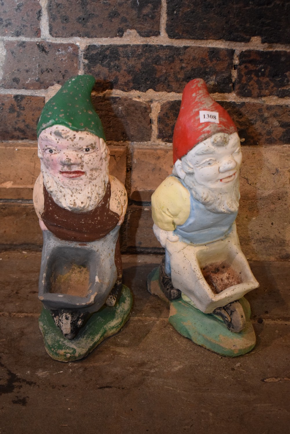 TWO COMPLIMENTARY GARDEN GNOMES (A/F) (35CM HIGH)
