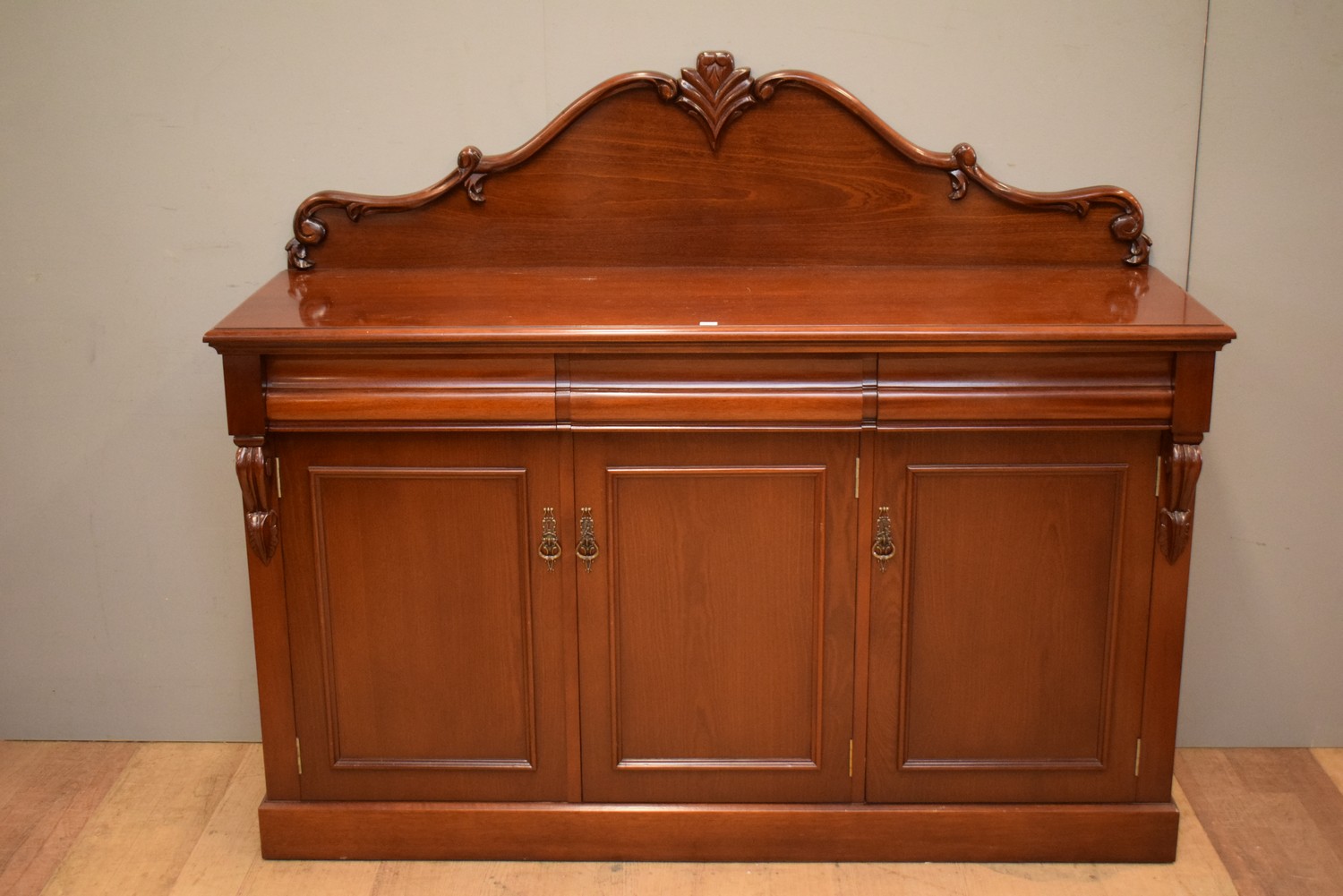 A VICTORIAN STYLE THREE DOOR TIMBER BUFFET (130H X 153W 48D CM) (PLEASE NOTE THIS ITEM MUST BE REMOVED BY CLIENTS OR CARRIERS AT THE CUSTOMERS EXPENSE)