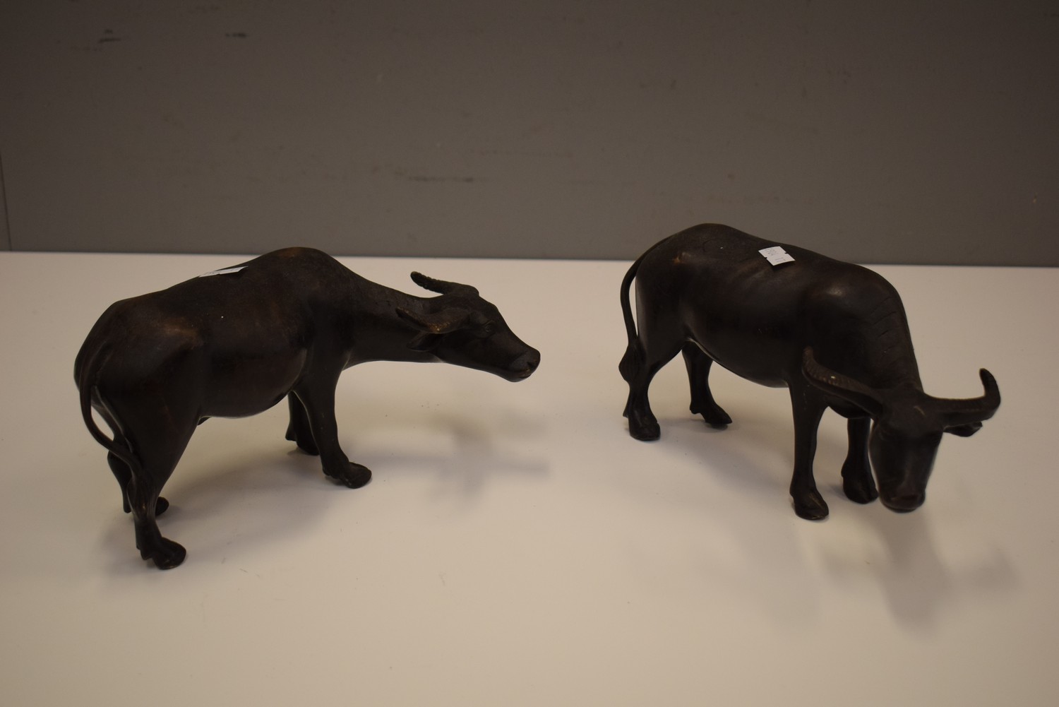 A PAIR OF METAL BULLS (12H X 24W X 10D CM)