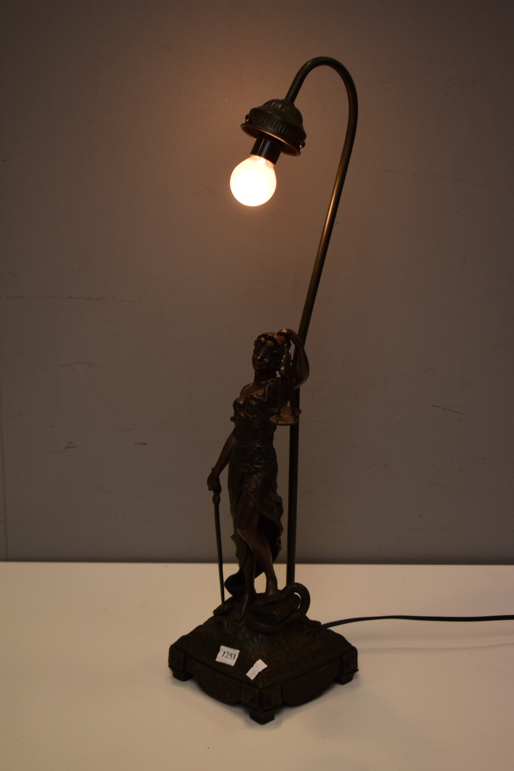 A BRONZE EFFECT FIGURAL TABLE LAMP DEPICITING JUSTICE (65 CM H)