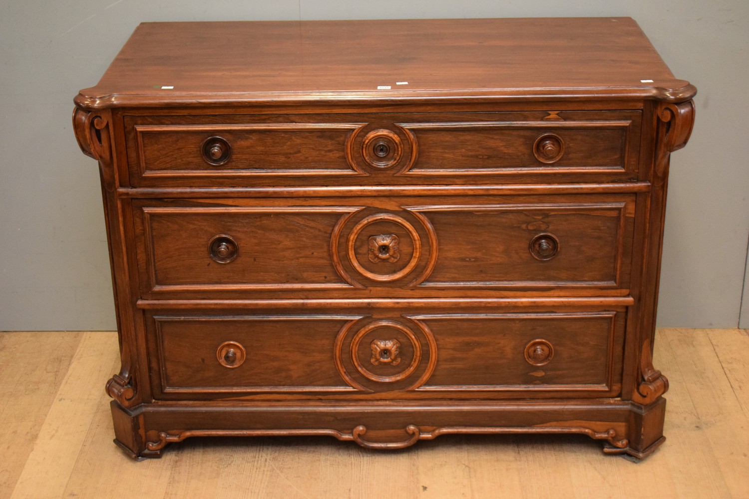 A ROSEWOOD LOUIS PHILLIPE STYLE THREE DRAWER COMMODE (84H X 122W X 59D CM)