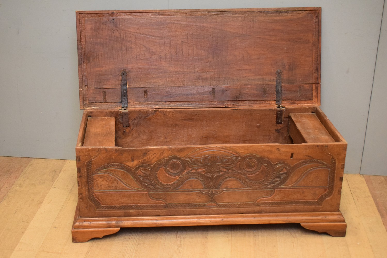 A DECORATIVELY CARVED FLIP TOP TIMBER COFFER (A/F) (49H X 125W X 51D CM)