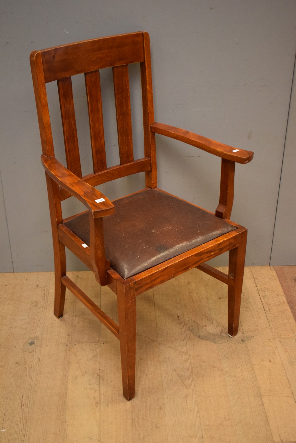 AN ARTS AND CRAFTS STYLE TIMBER CARVER WITH VINYL SEAT (103H X 64W X 50D CM)