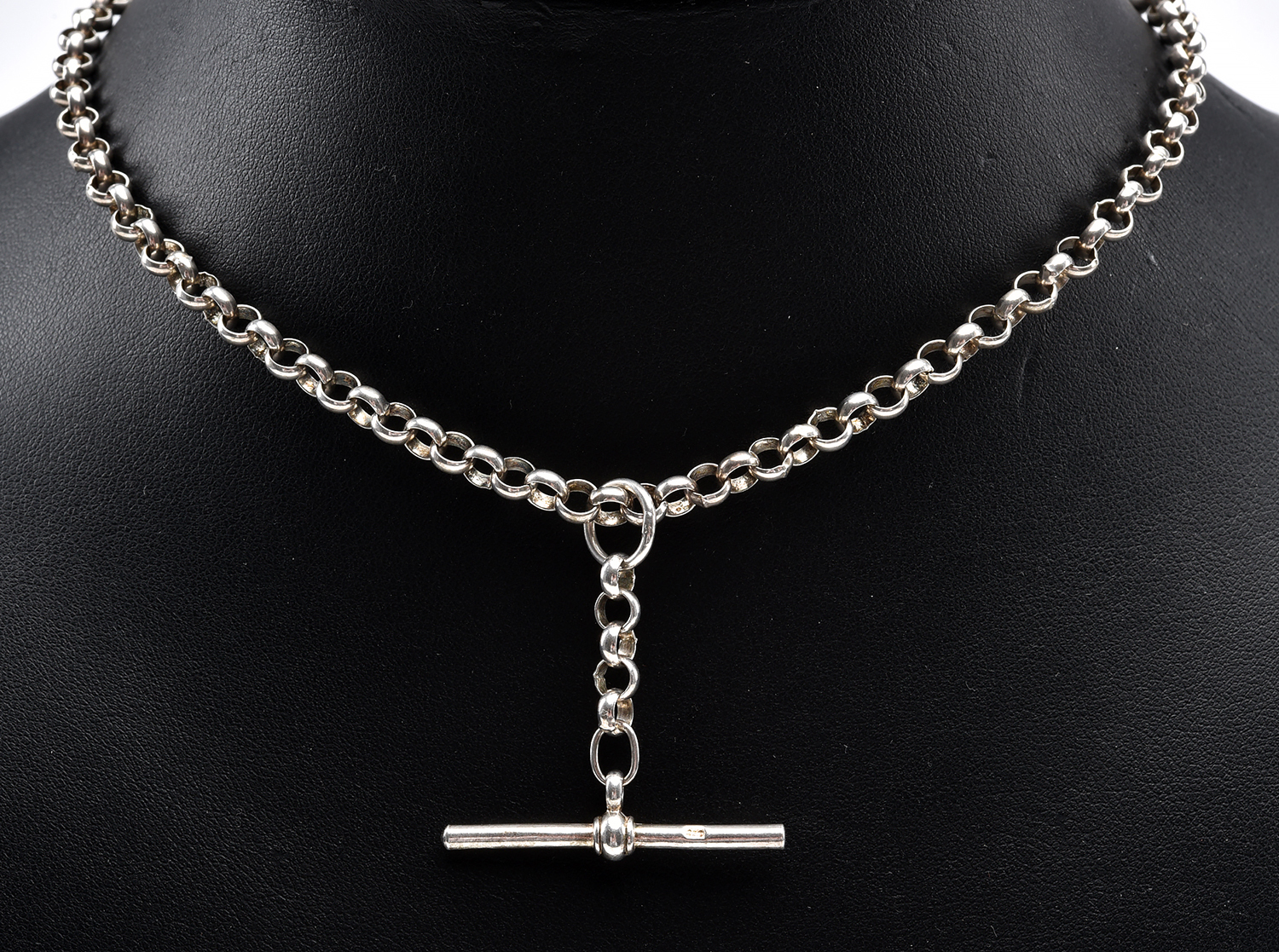A STERLING SILVER BELCHER LINK CHAIN WITH T-BAR FITTING, TOTAL LENGTH 460MM, 18.8GRAMS