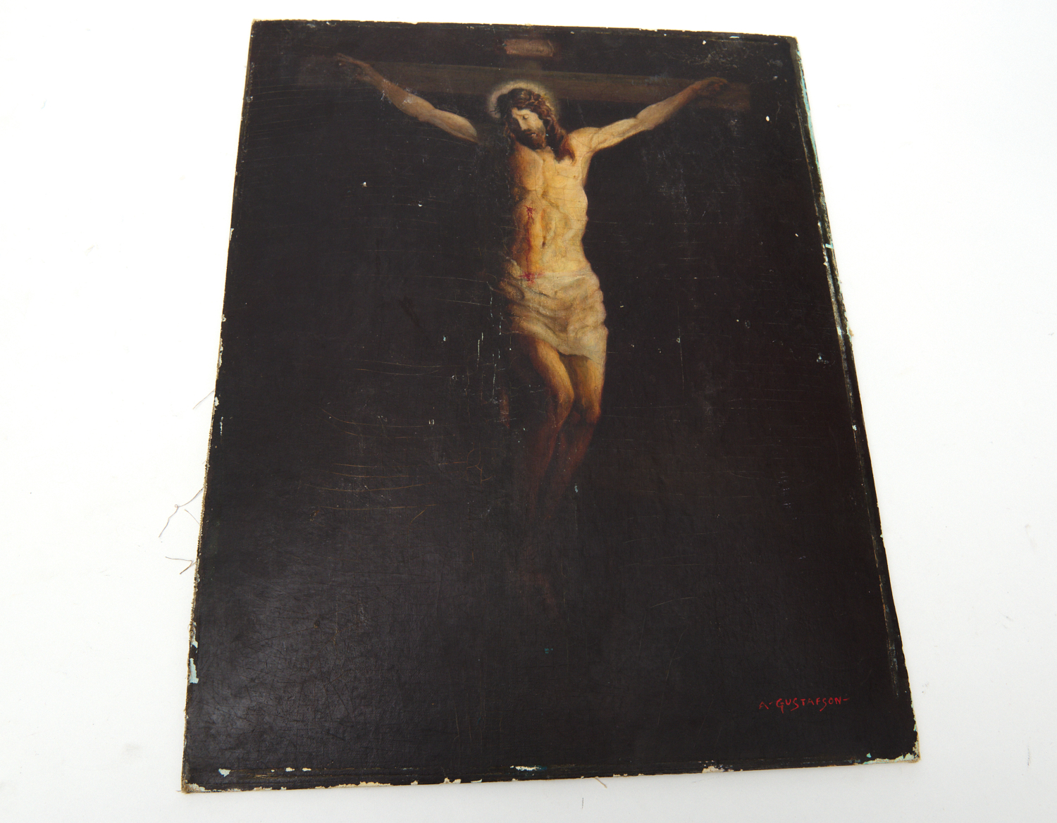 AN UNFRAMED OIL ON CANVASBOARD PAINTING OF CHRIST SIGNED A. GUSTAFSON 51 X 40CM