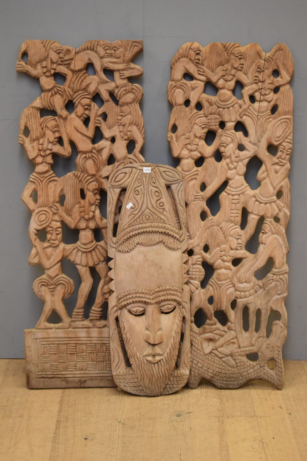 THREE TRIBAL CARVINGS, POSSIBLY INDONESIAN (THE LARGEST 118H X 45W CM)