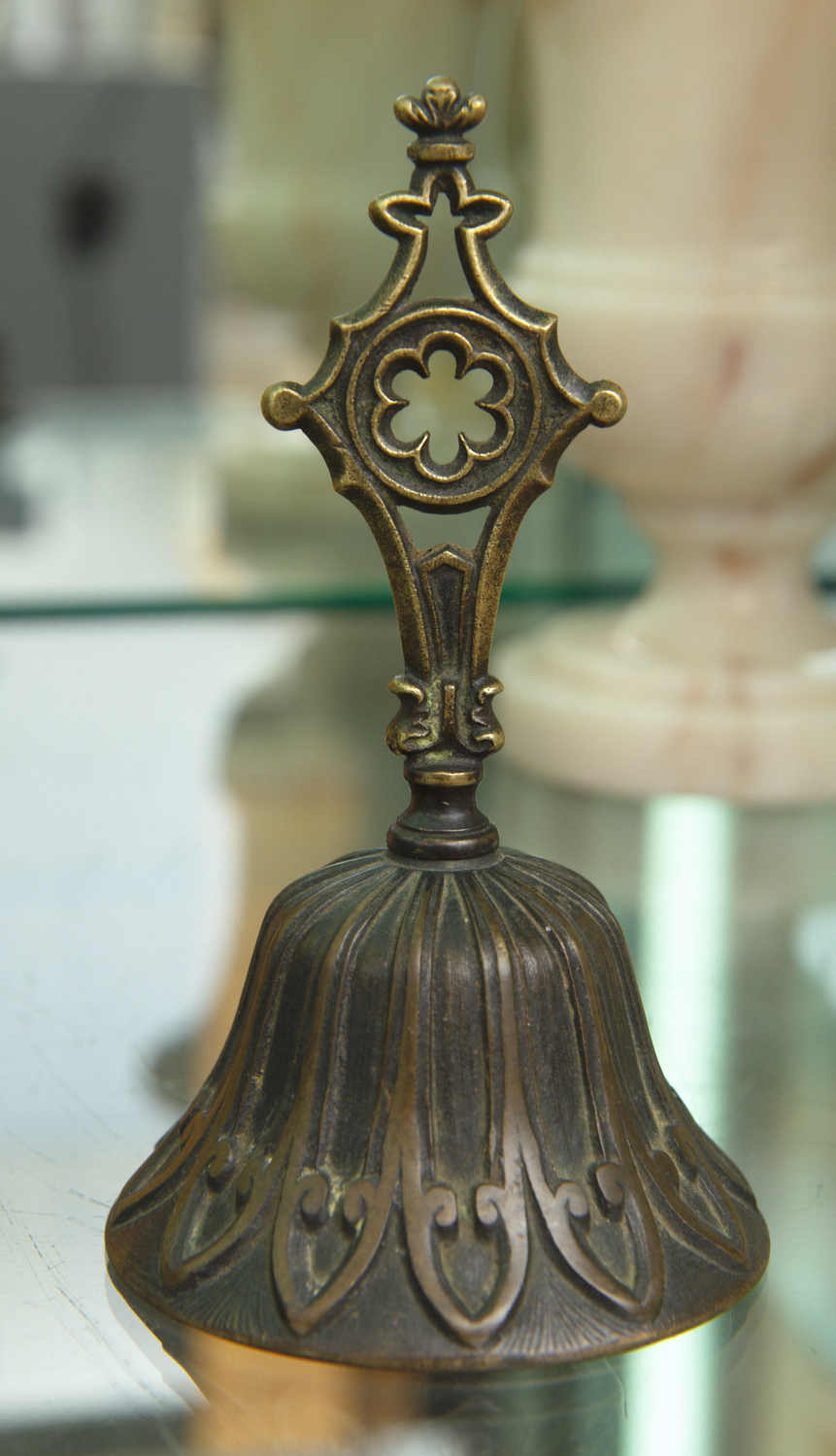 A CAST BRASS BELL, WITH ORNATE HANDLE