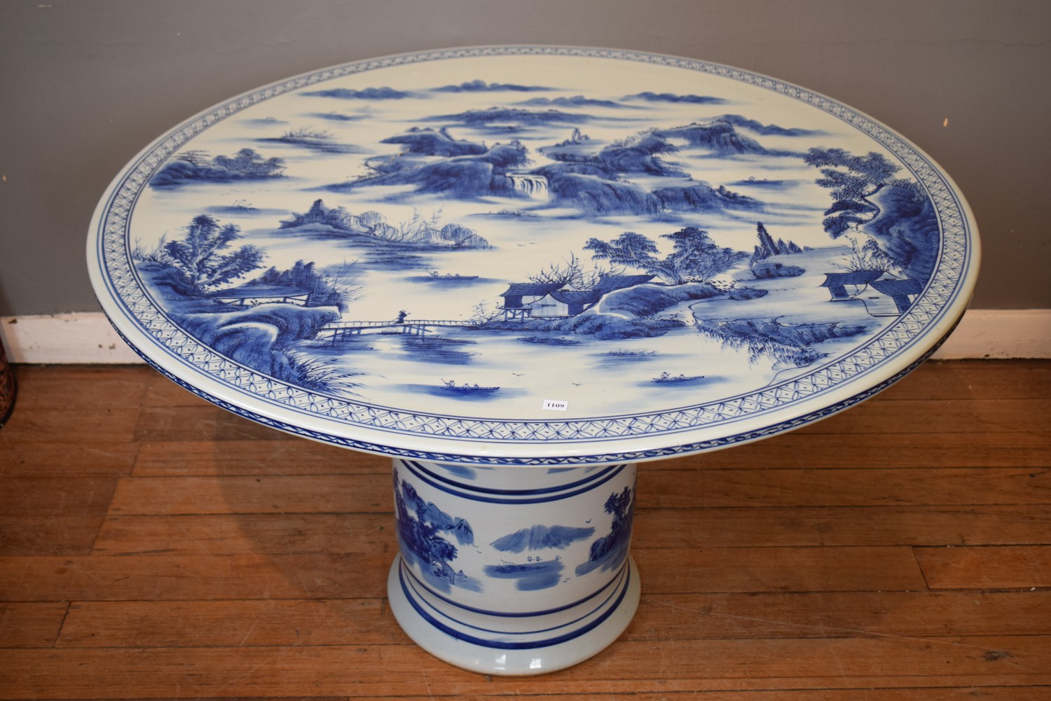 A DECORATIVE BLUE AND WHITE CERAMIC OUTDOOR TABLE (70H X 116D CM) (PLEASE NOTE THIS ITEM MUST BE REMOVED BY CLIENTS OR CARRIERS AT THE CUSTOMERS EXPENSE)