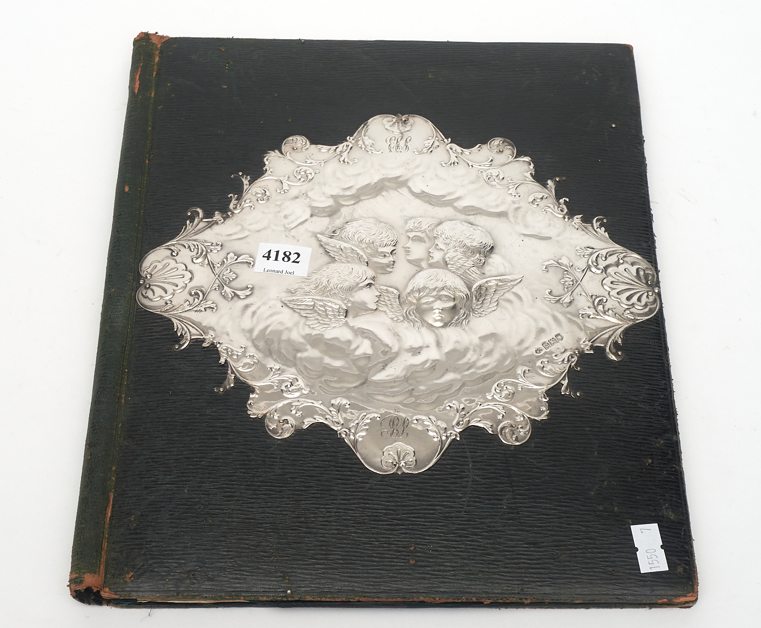 AN A4 EDWARDOAM STERLING SILVER 'REYNOLDS ANGELS' MOUNTED LEATHER WRITING FOLIO, THE MOUNTS HALLMARKED FOR WILLIAM COMYNS, LONDON, 1902