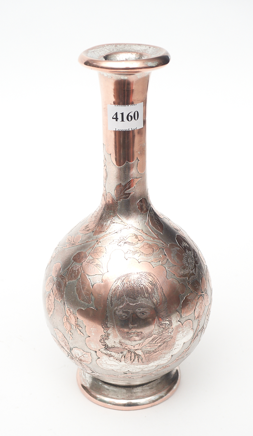 A 19TH CENTURY SILVERED COPPER OVERLAY DECANTER WITH PROFUSE BIRD AND FLOWER ETCHED DESIGN (NO STOPPER) H.26CM