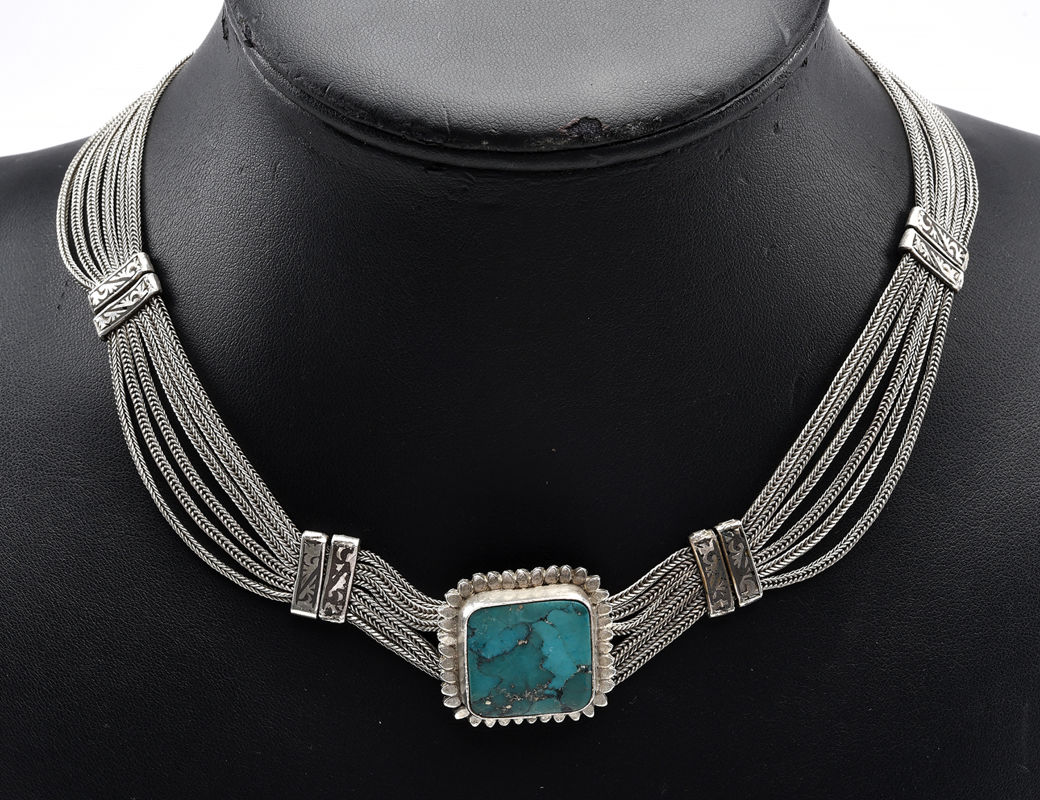 A VINTAGE MULTISTRAND NECKLACE WITH TURQUOISE FEATURE, IN STERLING SILVER