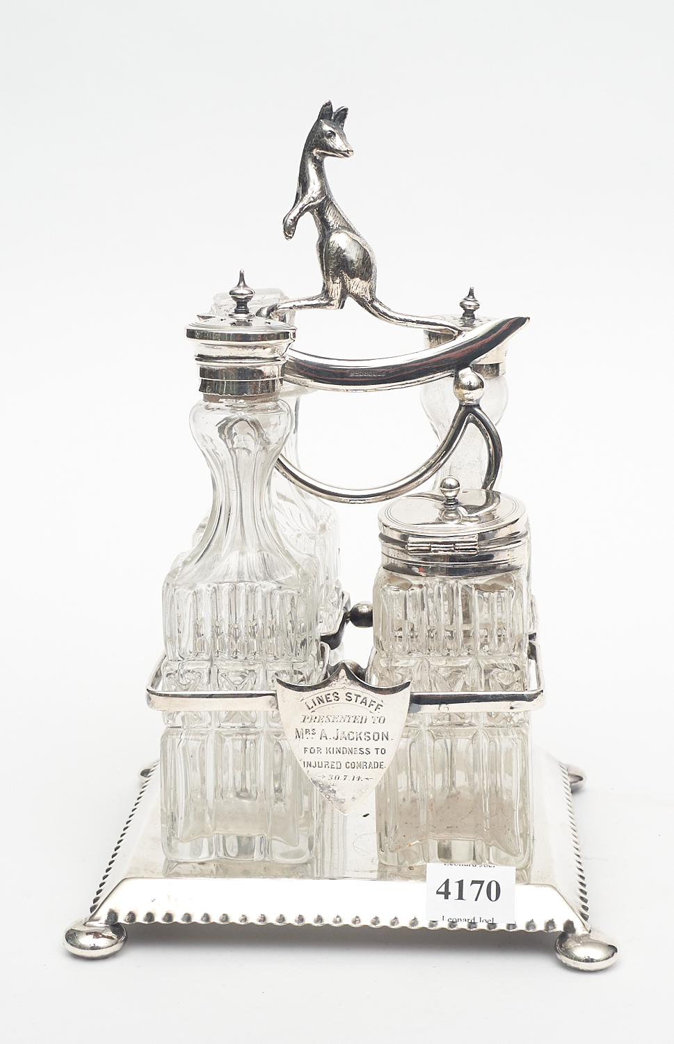 AN AUSTRALIAN WWI KANGAROO ADORNED SILVER PLATE AND CUT CRYSTAL PRESENTATION CRUET SET - LINES STAFF PRESENTED TO MRS A JACKSON FOR KINDNESS TO INJURED H.24CM