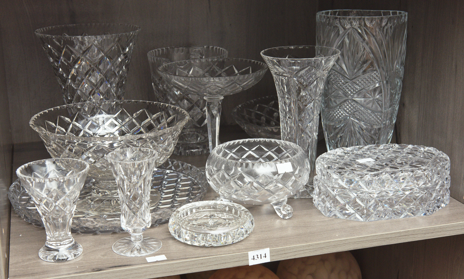 A SHELF OF CRYSTAL WARE INCLUDING VASES, BOWLS, CENTER PIECES, AND A LIDDED BOX