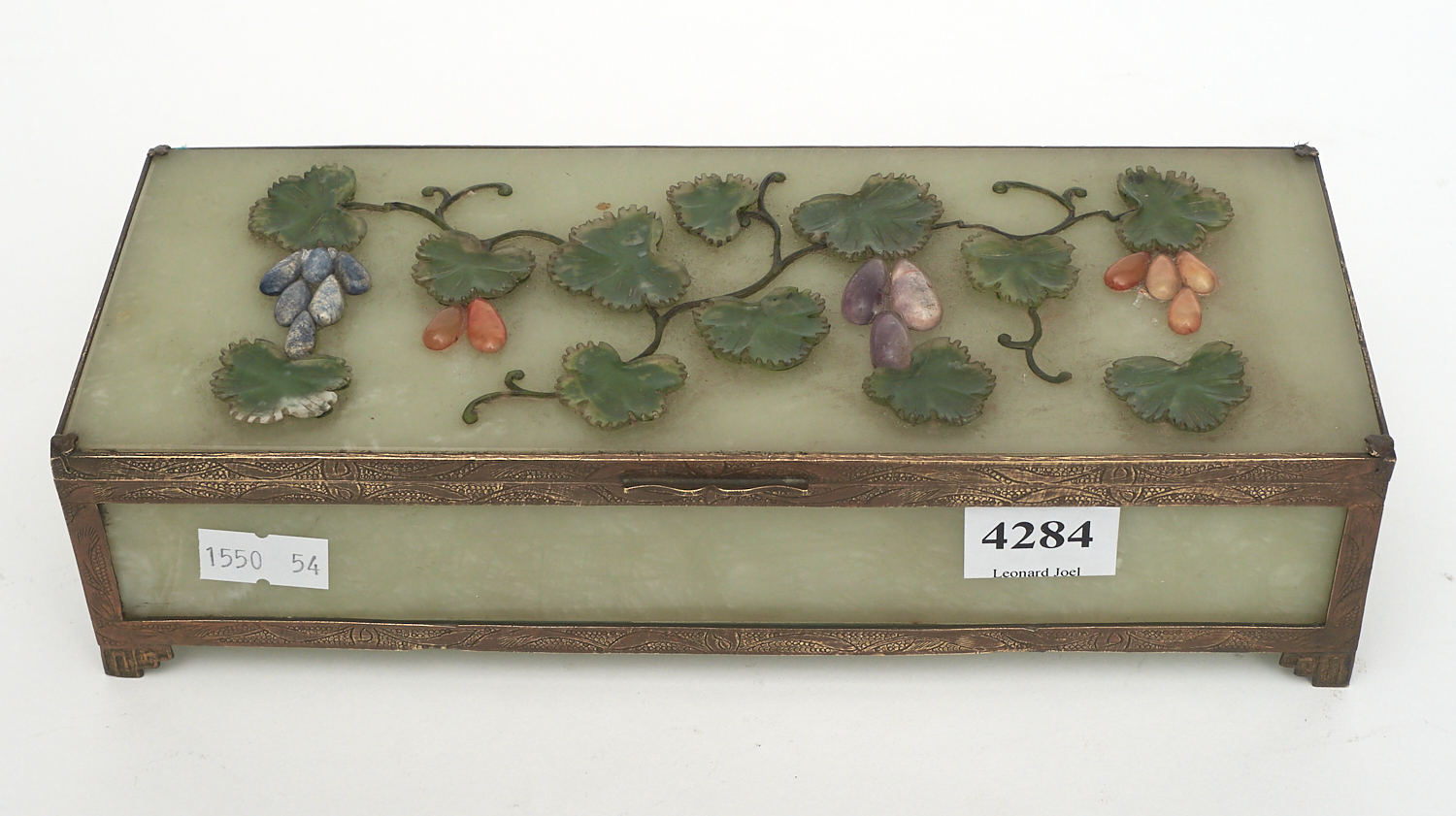 A 19TH CENTURY CHINESE JADE AND BRASS FLORAL BOX WITH SEMI-PRECIOUS STONES INCLUDING AGATE AND AMETHYST