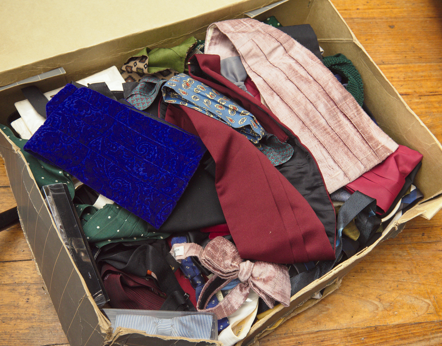A LARGE COLLECTION OF VINTAGE TIES, BOWTIES AND CUMMERBUNDS, SOME IN ORIGINAL PACKETS AND UNUSED