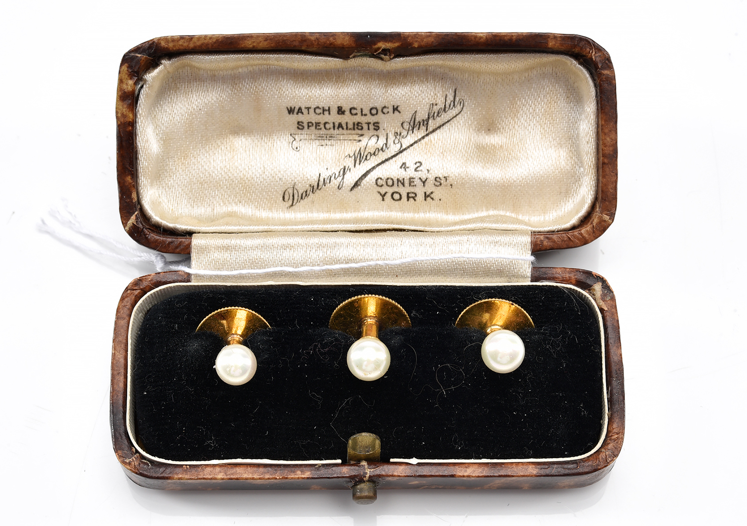 A SET OF THREE CULTURED PEARL SHIRT STUDS, GOLD LINED, BY DARLING WOOD & ANFIELD, IN ORIGINAL FITTED BOX