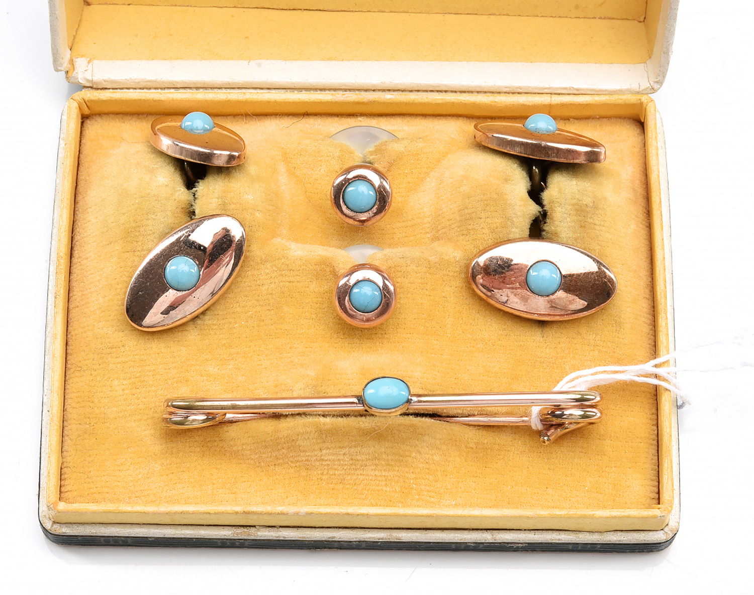 A VINTAGE TURQUOISE SET CUFFLINK AND SHIRT STUD SET IN GOLD LINED METAL, BOXED