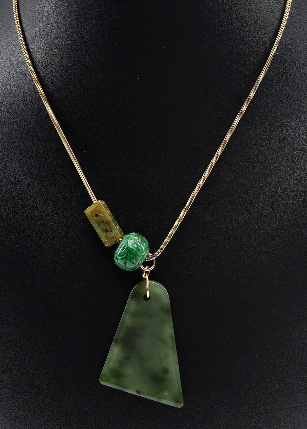 A NEPHRITE PENDANT AND TWO JADEITE BEADS, TO A SILVER GILT CHAIN