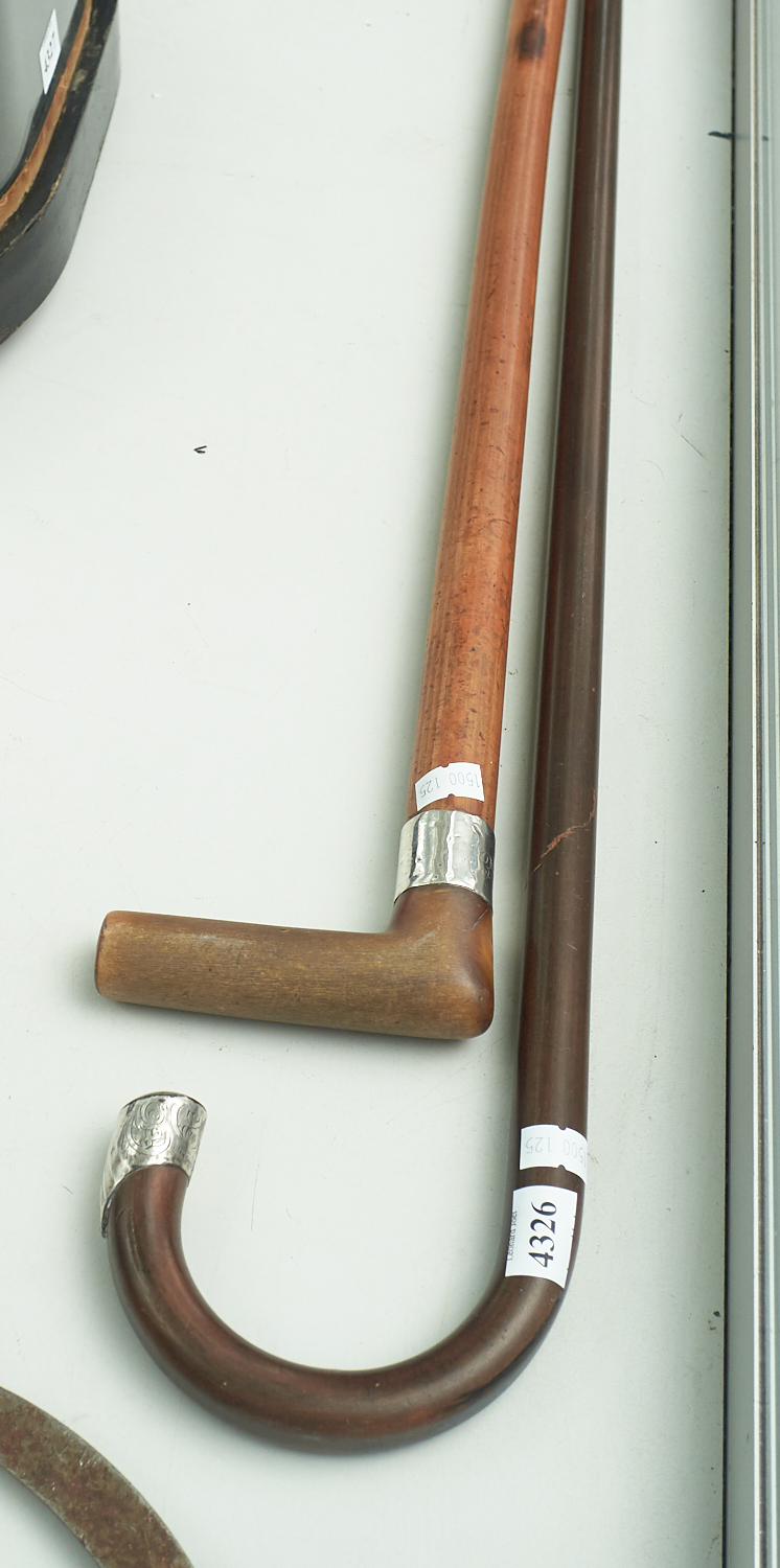 TWO 1900S CANE AND WOODEN WALKING STICKS, ONE WITH HORN HANDLE AND BOTH WITH STERLING SILVER COLLAR AND CAP