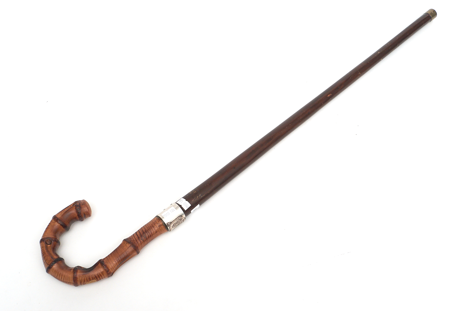 A 19TH CENTURY CANE HANDLED BIRCH SHAFTED WALKING STICK WITH MONOGRAMMED STERLING COLLAR HSS L.90CM