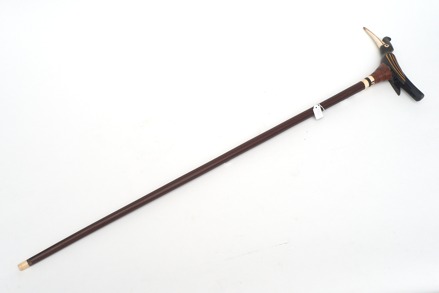 A 1920S TRIBAL CARVED BIRD HANDLE WALKING STICK WITH BONE BEAK ON WOODEN SHAFT L.86CM