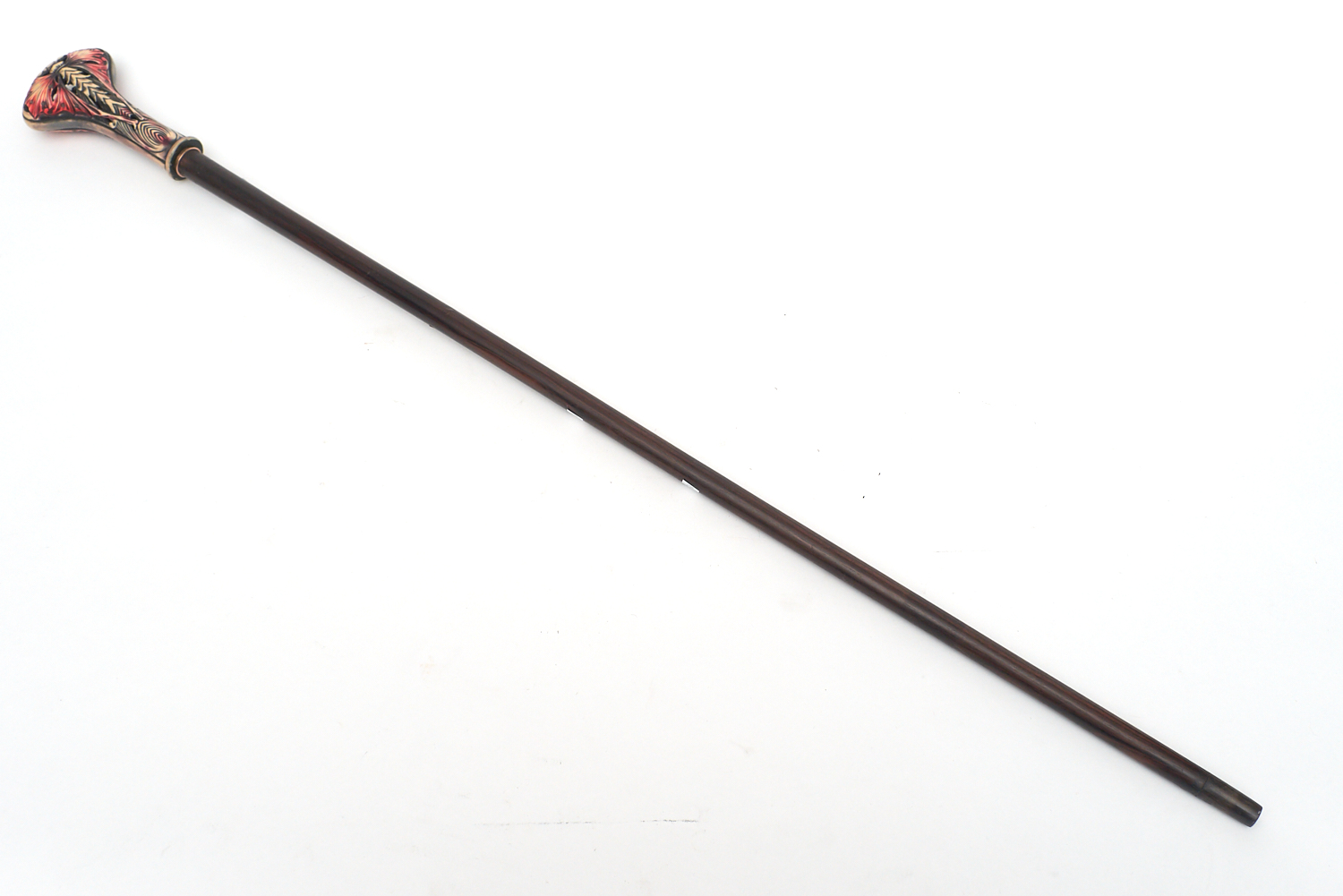 A 1920S ART NOUVEAU XYLONITE CARVED BUTTERFLY HANDLED WALKING STICK ON MAHOGANY SHAFT L.91CM