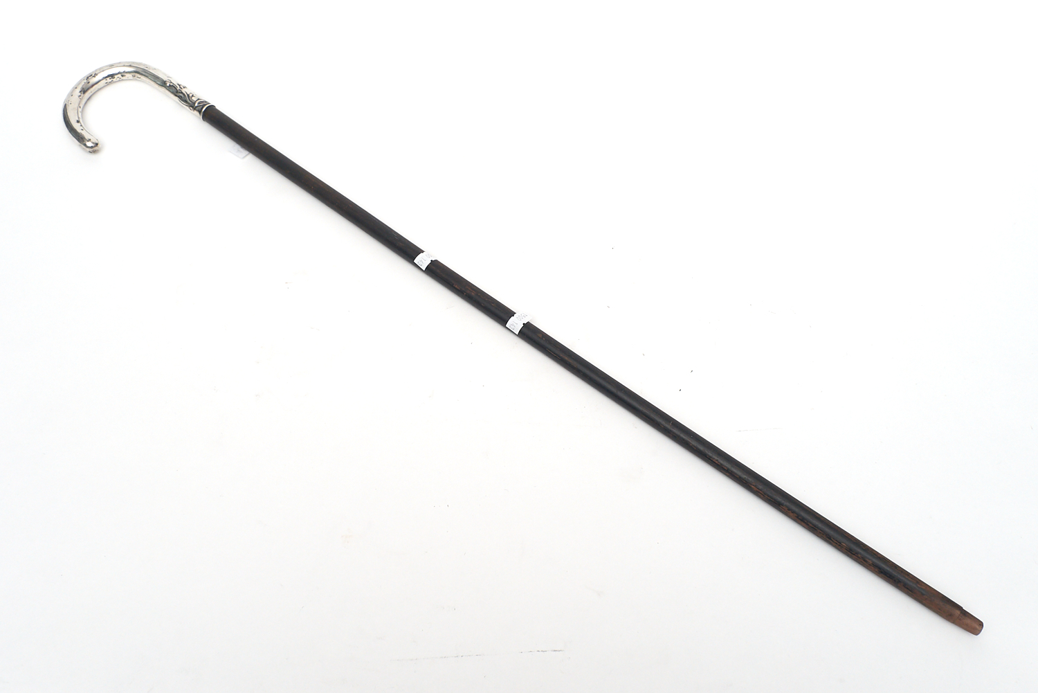 AN ART NOUVEAU FLORAL DECORATED STERLING SILVER CURVED HANDED WALKING STICK ON EBONY SHAFT L.87CM