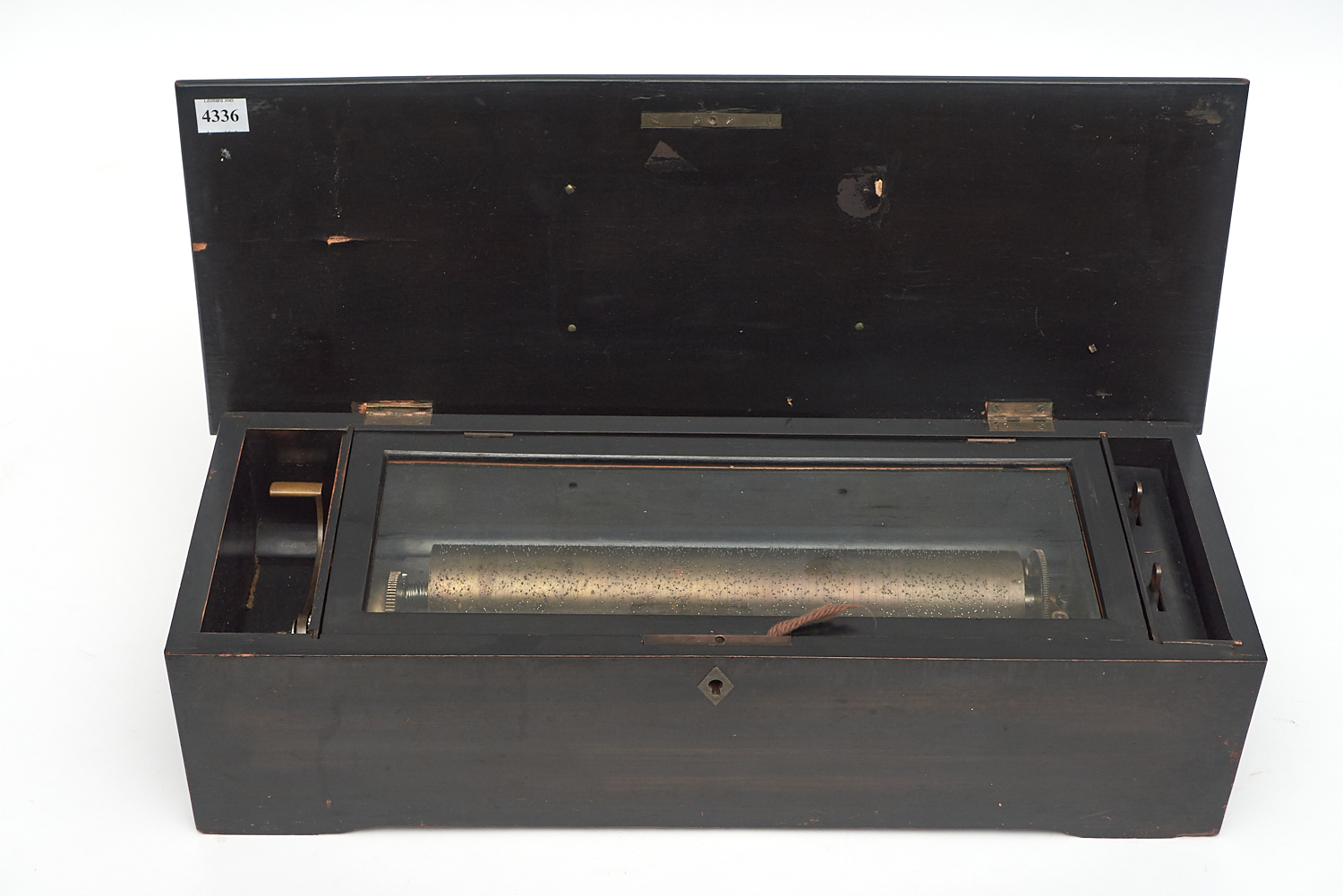 A 19TH CENTURY SWISS CYLINDER MUSIC BOX (NOT IN WORKING ORDER)