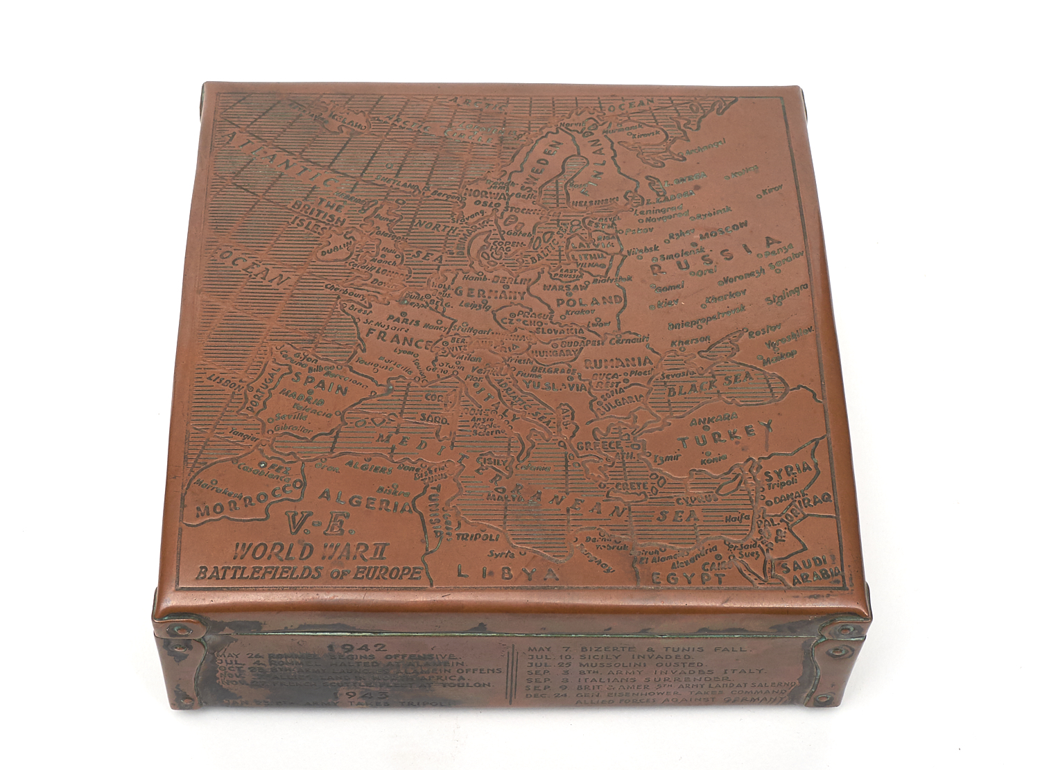 A RARE WORLD WAR II: A "VICTORY IN EUROPE" COMMEMORATIVE CIGAR BOX H.6CM X W.16CM X W.16CM