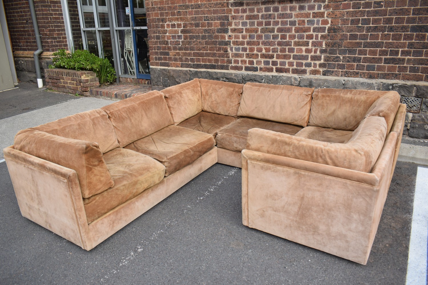 A 1970S MODULAR LOUNGE IN TAN SUEDE (A/F STAINS TO UPHOLSTERY) (64 X 250W X 250D CM)