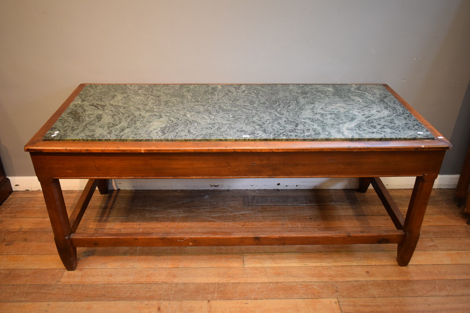 A MARBLE TOPPED RUSTIC FARMHOUSE STYLE TABLE ( 76H X 183W X 81D CM) (A/F) (PLEASE NOTE THIS ITEM MUST BE REMOVED BY CLIENTS OR CARRIERS AT THE CUSTOMERS EXPENSE)