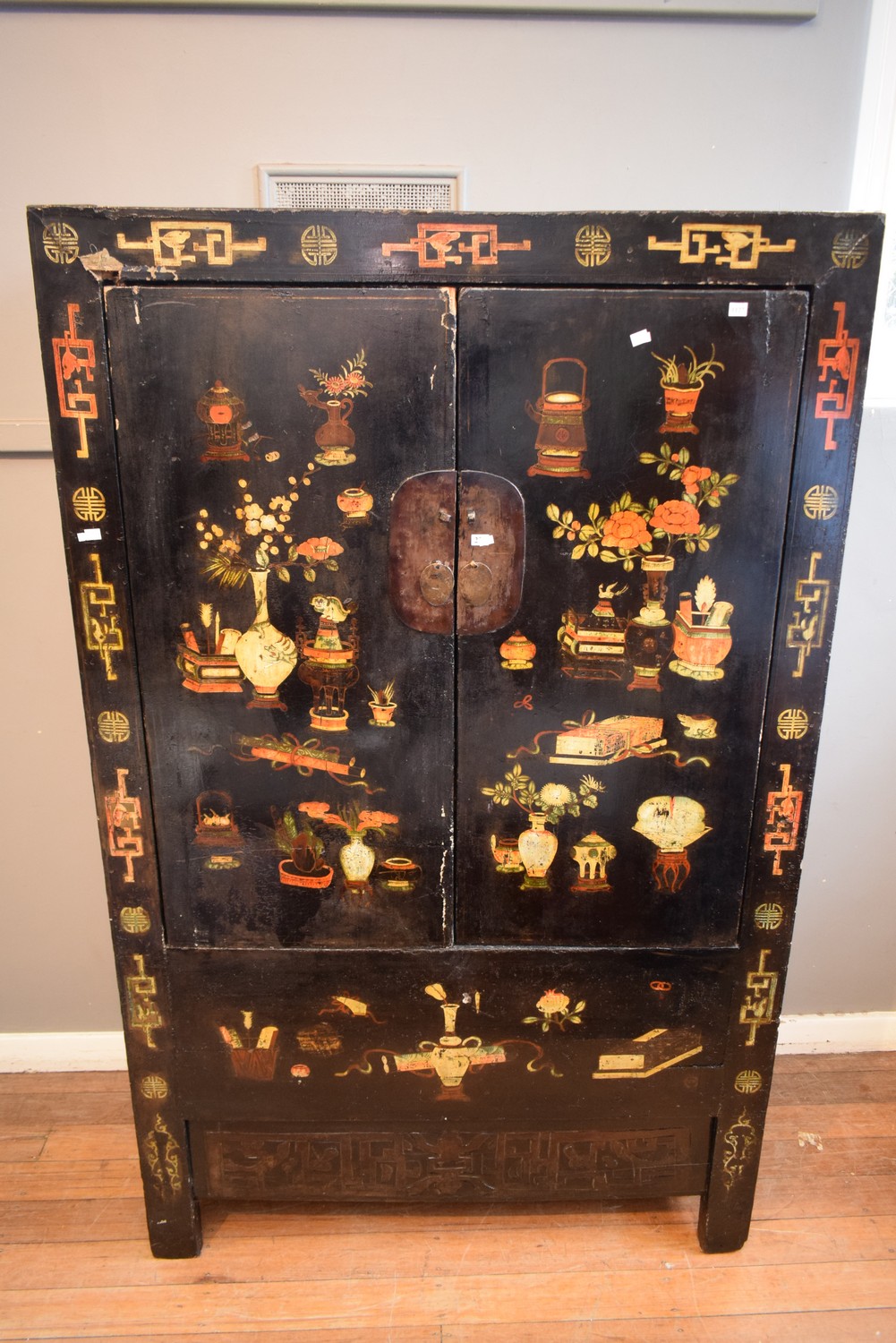 A CHINESE PAINTED CABINET (A/F) (193H X 120W X 53D CM) (PLEASE NOTE THIS ITEM MUST BE REMOVED BY CLIENTS OR CARRIERS AT THE CUSTOMERS EXPENSE)