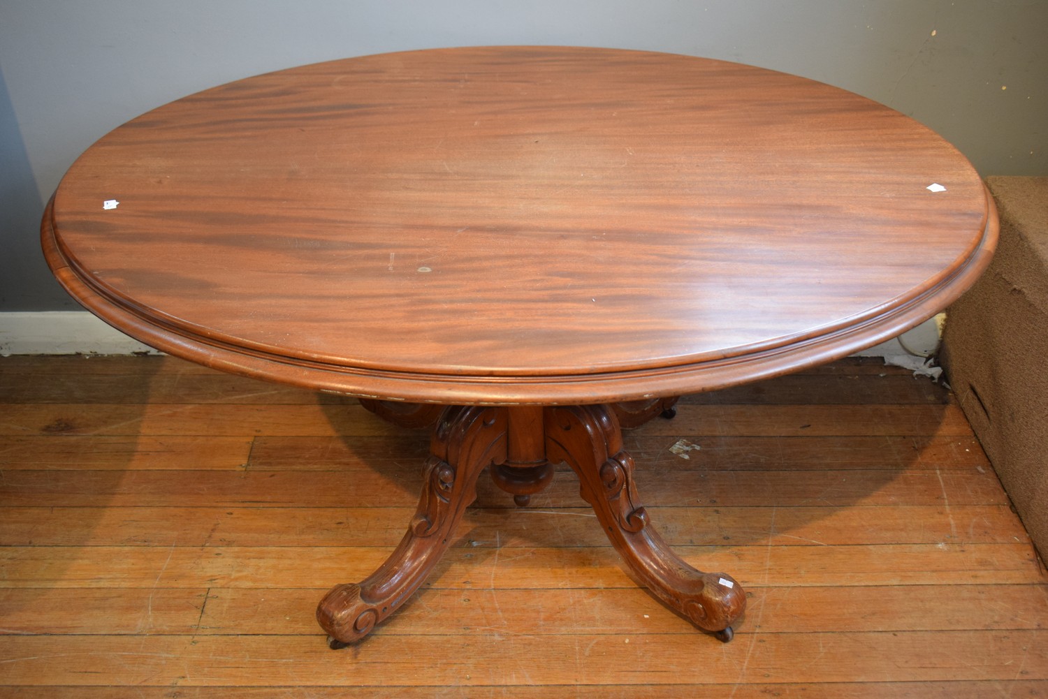 AN OVAL FLIP TOP DINING TABLE WITH CARVED BASE (A/F) (73H X 145W X 114D CM)