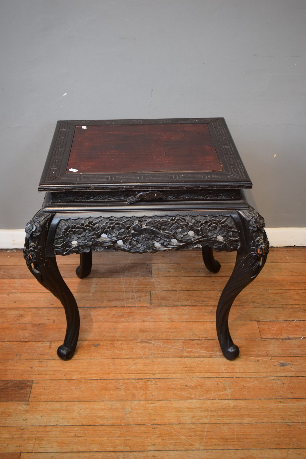 A CARVED EBONISED CHINESE SIDE TABLE (A/F) (78H X 84W X 76D CM)