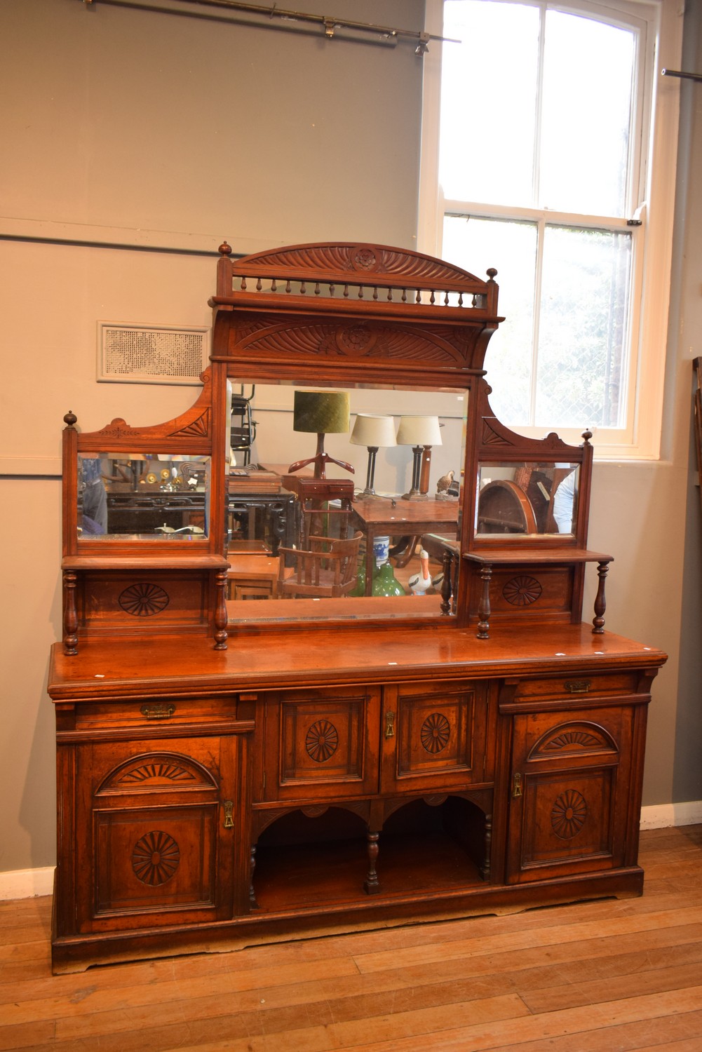 A SUBSTANTIAL MIRROR BACKED SIDEBOARD WITH CARVED TIMBER DETAILING (A/F) (235H X 214W X 57D CM) (PLEASE NOTE THIS ITEM MUST BE REMOVED BY CLIENTS OR CARRIERS AT THE CUSTOMERS EXPENSE)