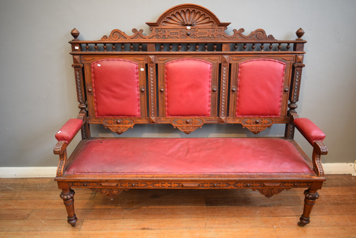 A LARGE EDWARDIAN VINYL UPHOLSTERED BENCH SEAT (A/F) (143H X 175W X 56D CM)