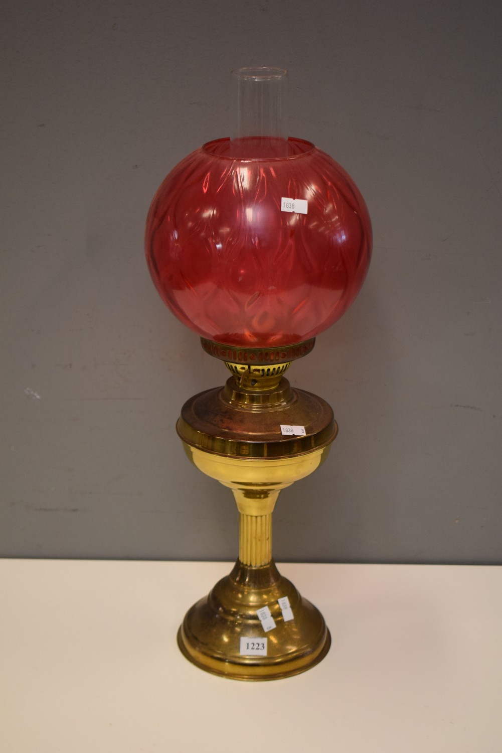 A BRASS AND COLOURED GLASS OIL LAMP (55 CM H)