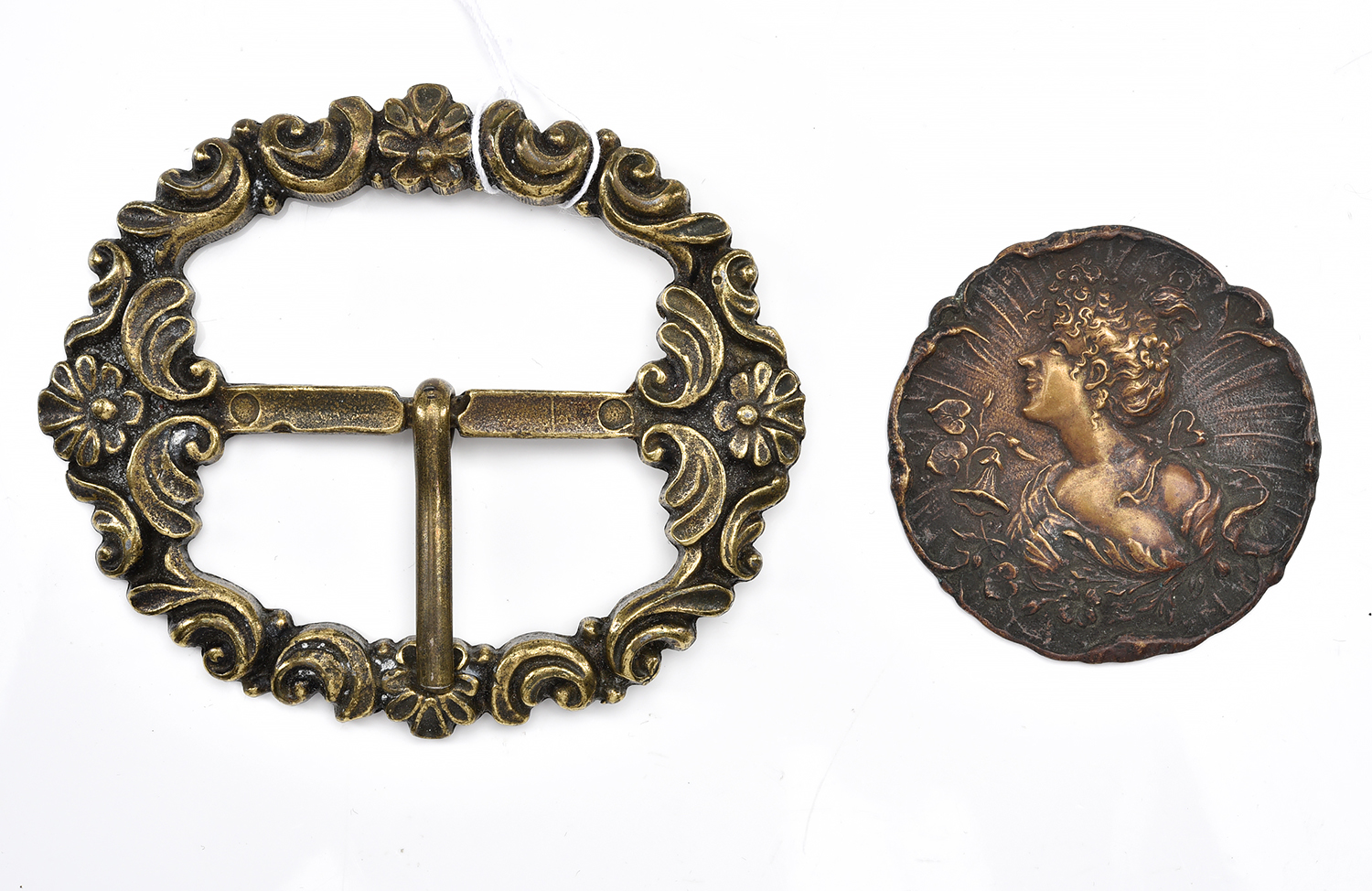 AN ART NOUVEAU PLAQUE DEPICTING A LADY IN PROFILE, TOGETHER WITH A VINTAGE BELT BUCKLE
