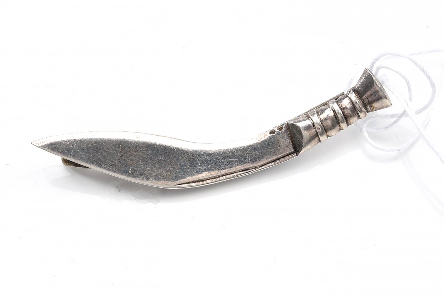 A SILVER CLIP FEATURING A NEPALESE GURKHA KNIFE, TOTAL LENGTH 50MM