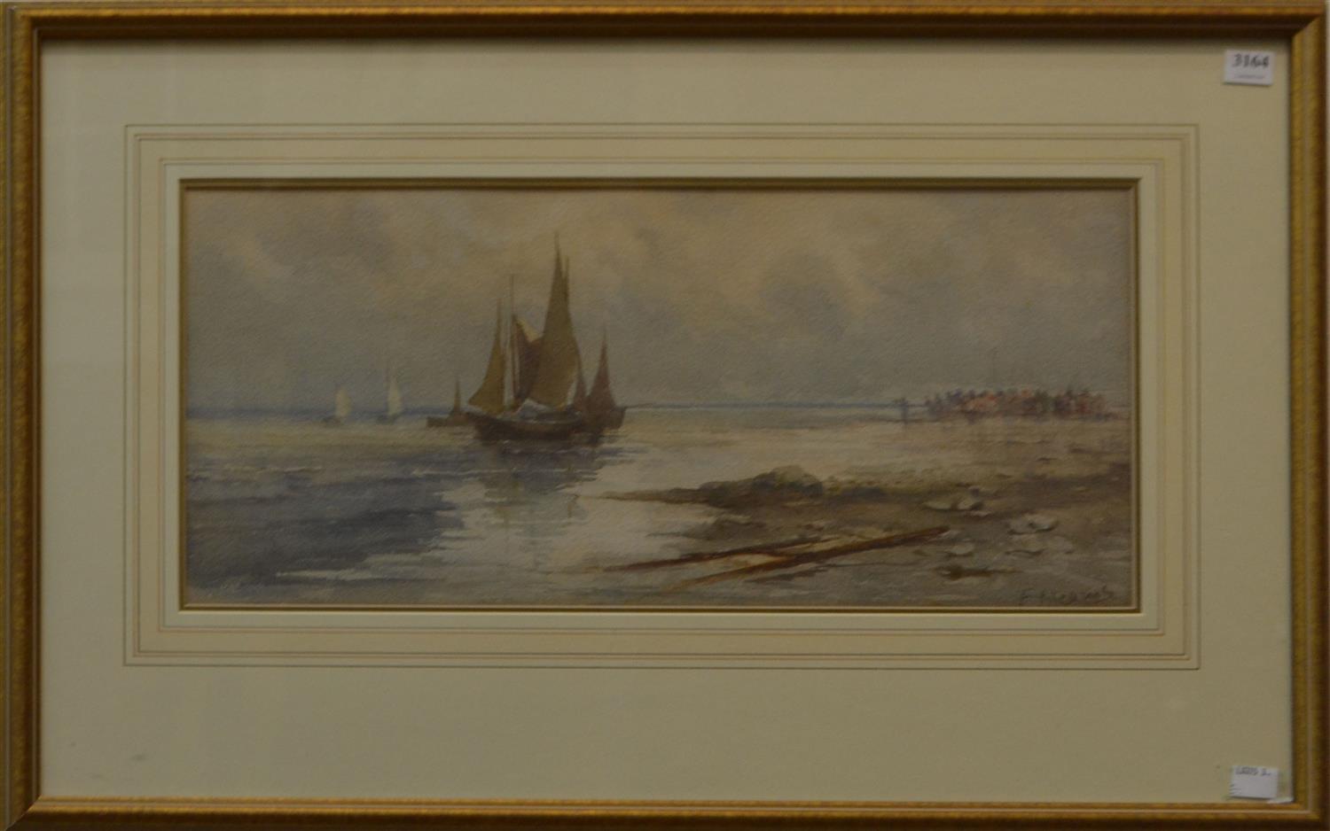 FANNY MEARMS, SHORE SCENE, WATERCOLOUR, 23 X 49CM, FRAME SIZE: 45 X 69.5CM, CONDITION: MINOR DISCOLOURATION