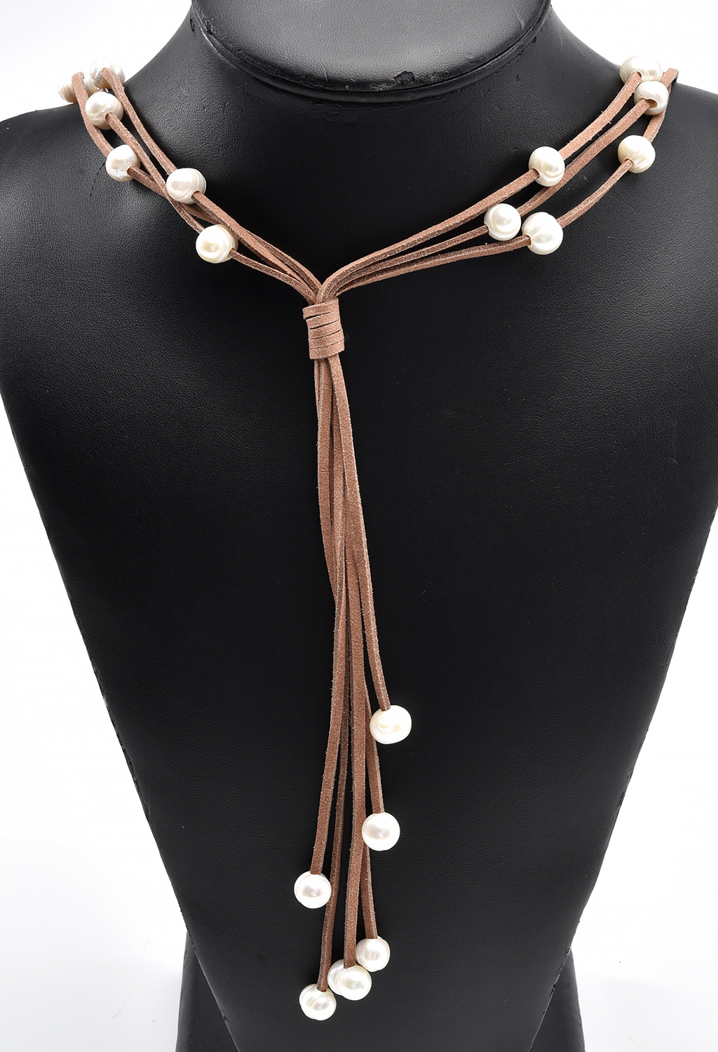 A MUTLI-STRAND BROWN LEATHER TASSLE NECKLACE SET WITH PEARLS